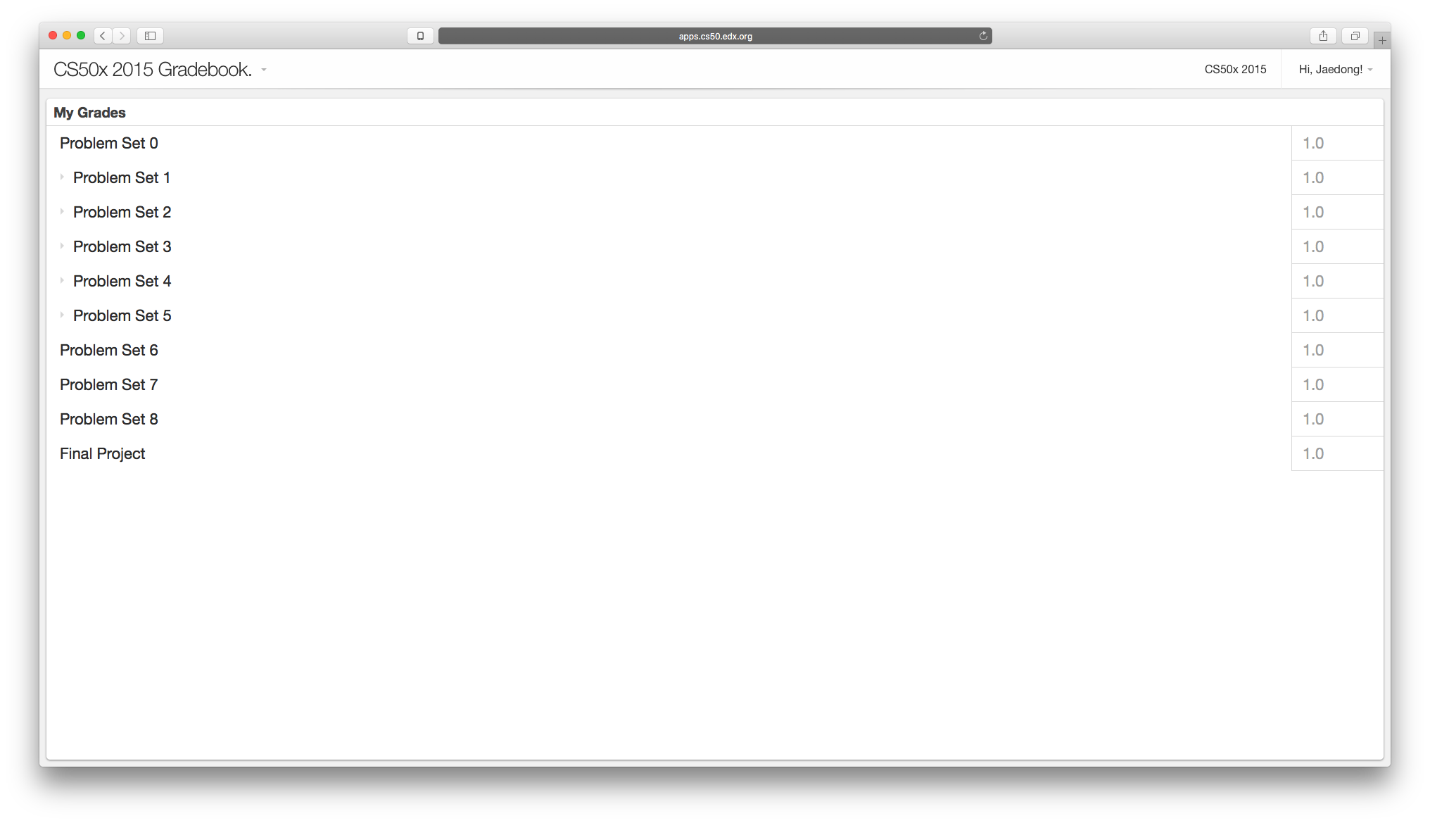 ๋๋ถ๋ถ ์ฃผ๋น ํ ๊ฐ์ง์ ๊ณผ์ ๊ฐ ์๋๋ฐ Problem Set์์ ํ์ธ์ด ๊ฐ๋ฅํ๋ค. Problem Set์ 0๋ถํฐ 8, ๊ทธ๋ฆฌ๊ณ ๊ธฐ๋ง ๊ณผ์ (Final Project)๊น์ง ์ด 10๊ฐ๊ฐ ์กด์ฌํ๋ค. ๊ฐ๊ฐ์ Problem Set์ ๋ ๋ค์ ์์ ๋ช ๊ฐ์ง์ ๋ฌธ์ ๋ค๋ก ๊ตฌ์ฑ๋์ด ์๋ค. Problem Set 1๋ถํฐ 5๊น์ง๋ ์์ค์ฝ๋๋ฅผ ์ ์ถํ๋ฉด ์ปดํจํฐ๊ฐ ์ง์ ์ฑ์ ํด์ ๋ฐ๋ก ๊ฒฐ๊ณผ๋ฅผ ํ์ธํ ์ ์๊ณ ๊ทธ ์ธ ๊ณผ์ ๋ค์ ์ ์ถํ๋ฉด ์ต๋ 2์ฃผ์์ CS50 ์คํญ์ด ์ฑ์ ํ์ฌ Gradebook์ ํตํด ๊ทธ ๊ฒฐ๊ณผ๋ฅผ ํ์ธํ ์ ์๋ค.