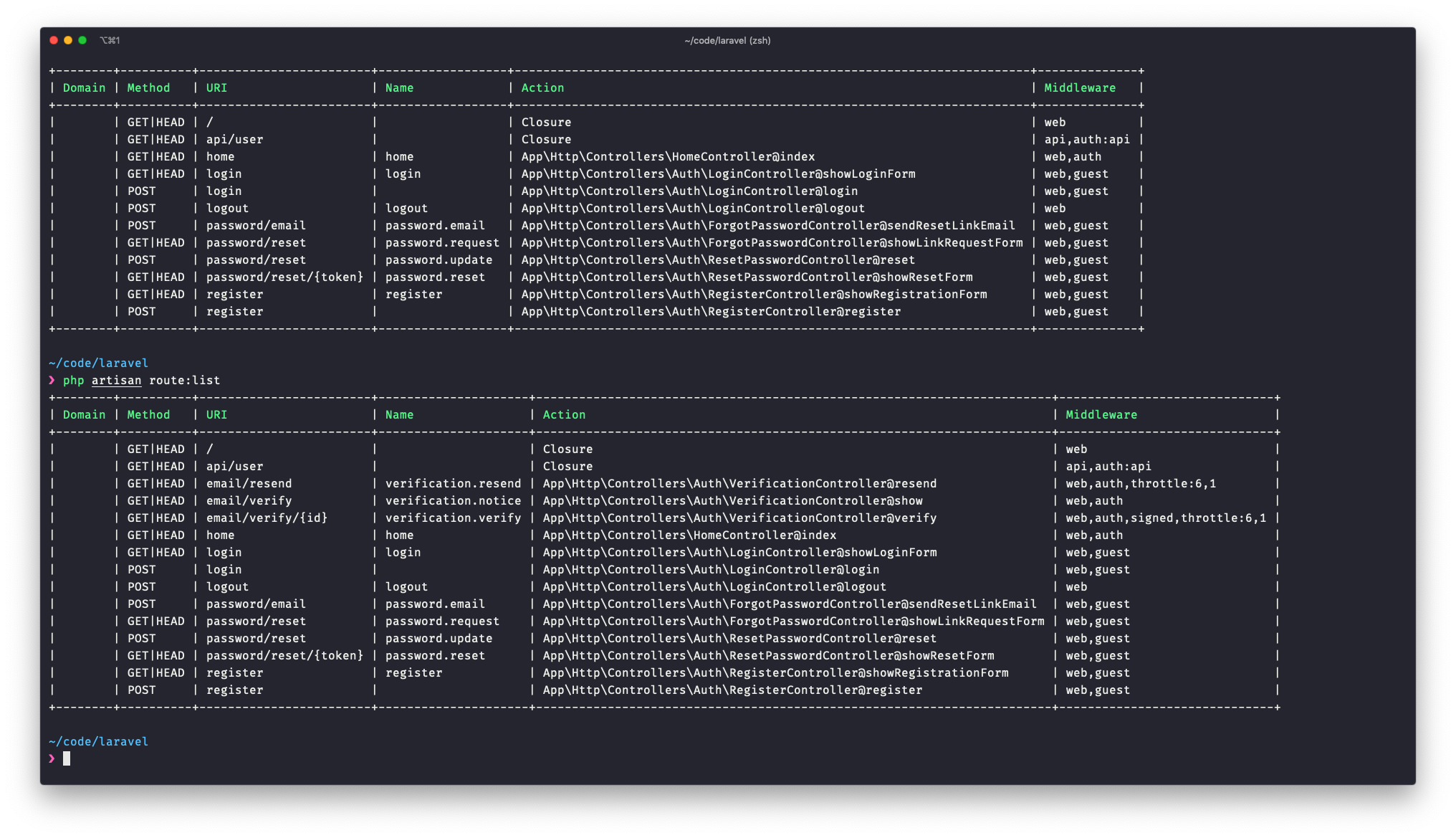 Auth::routes(['verify' => true]);['verify' => true]를 추가하기 전과 후의 라우트 목록을 보면 그 차이를 알 수 있다.