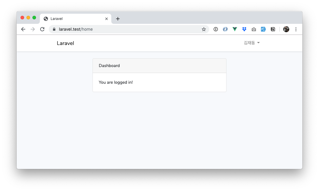 이메일 인증을 사용하면 verified 미들웨어를 통해 이메일 인증을 받지 않은 사용자가 페이지에 접근할 수 없도록 할 수 있다. 예를 들어 Laravel에서 로그인 후 기본으로 이동하는 /home 페이지의 기본 모습은 다음과 같은데