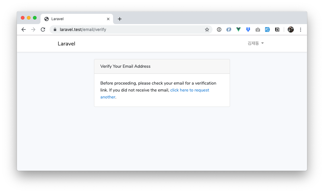 Route::get('/home', 'HomeController@index')->name('home')->middleware('verified');web.php에서 verified 미들웨어를 위와 적용시키면 /home으로 접속해도 이메일 인증을 받지 않은 사용자에게는 아래와 같은 화면이 보인다.