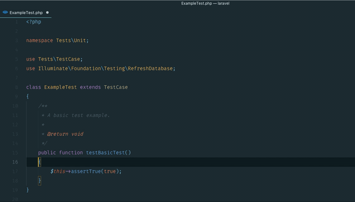 ExampleTest.php ํ์ผ์ ํด๋์ค์ ๋ฉ์๋์ ์ด๊ธฐ ๊ดํธ์ ์์น๋ฅผ ๋ณ๊ฒฝ์ํค๊ณ ์ปค๋งจ๋ ํ๋ ํธ์์ Format Document๋ฅผ ์คํ์ํค๋ฉด ์๋ ๊ทธ๋ฆผ์ฒ๋ผ PSR-2 ํ์์ ๋ง๊ฒ ์๋์ผ๋ก ์์ ํ๋ ๊ฒ์ ํ์ธํ ์ ์๋ค.