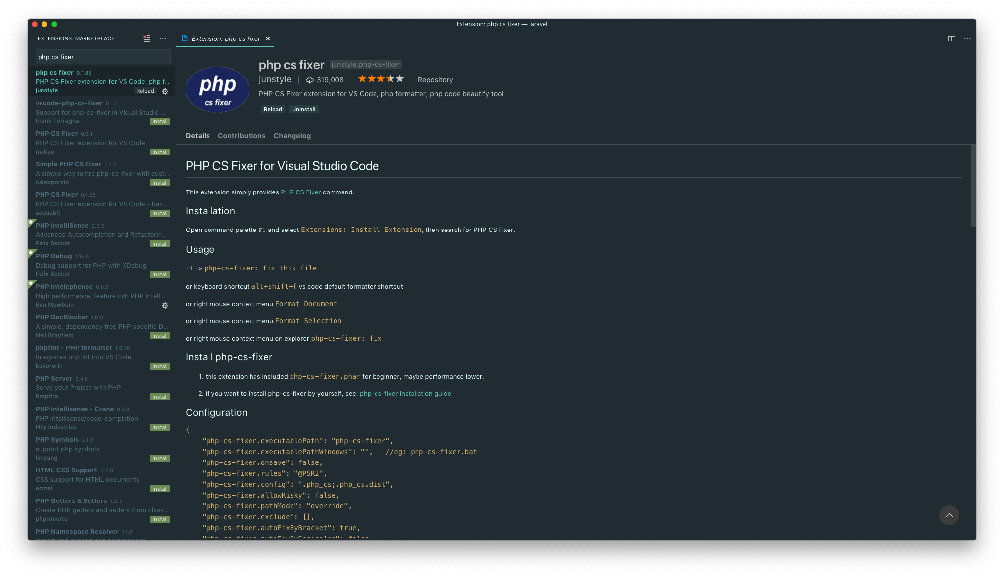 ํ์ฅ ํ๋ก๊ทธ๋จ์์ php cs fixer๋ฅผ ๊ฒ์ํ๊ณ ์ค์นํ๋ค.